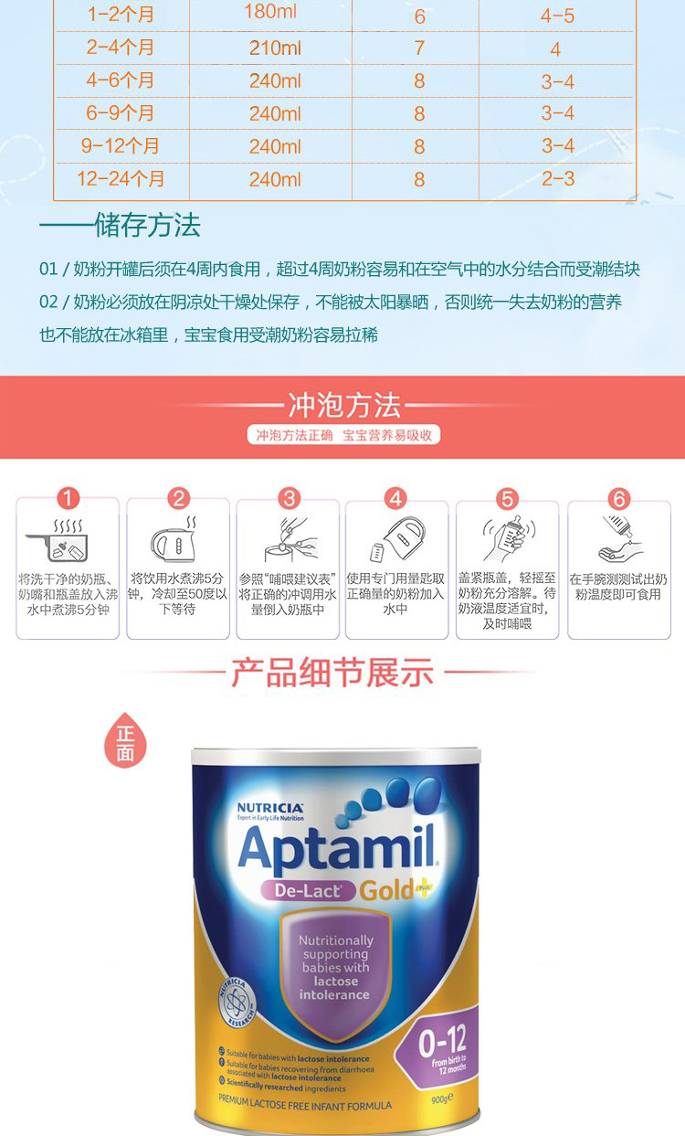 【储存方法】 阴凉干燥处,避免阳光直射,奶粉不能放冰箱,一个月内食完。